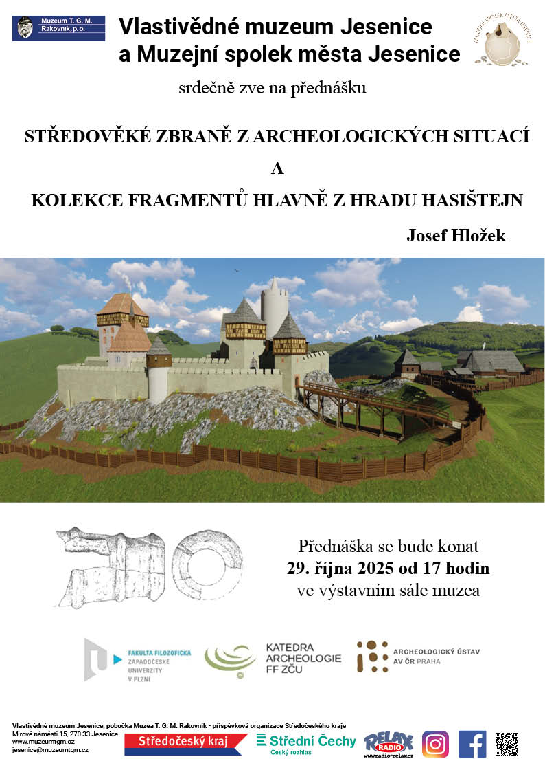 Vlastivědné muzeum Jesenice a Muzejní spolek města Jesenice srdečně zve na přednášku Středověké zbraně z archeologických situací a kolekce fragmentů hlavně z hradu Hasištejn. Přednášet bude PhDr. Josef Hložek, Ph.D. z Katedry archeologie. Přednáška se bude konat 29. října 2025 od 17 hodin ve výstavním sále muzea.