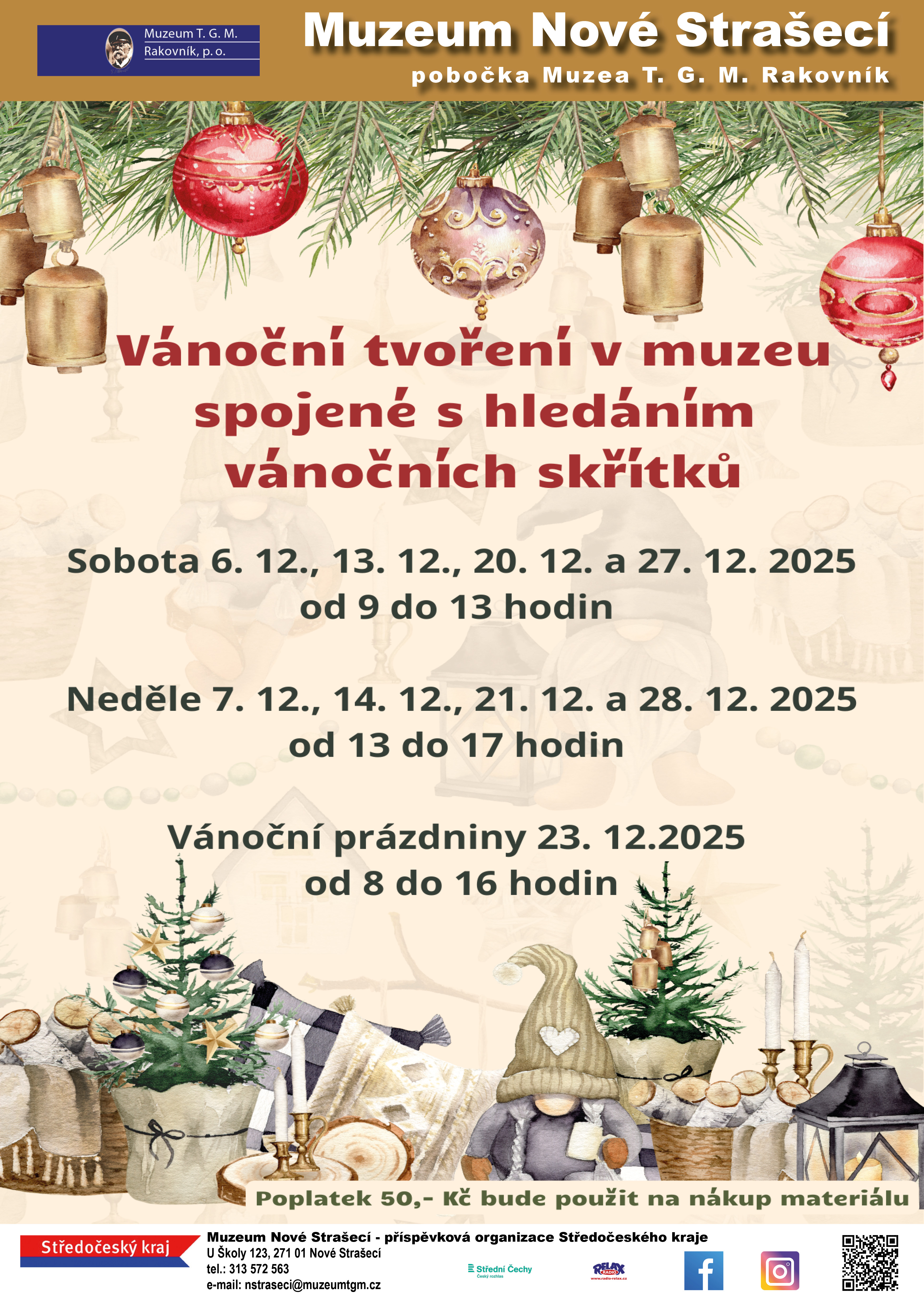 Advent je ideální čas pro společné zážitky, a proto Muzeum Nové Strašecí připravilo oblíbené Vánoční tvoření. Přijďte si užít radost z výroby vlastních vánočních dekorací a drobných dárků, které si budete moci odnést domů nebo rovnou zavěsit na svůj vánoční stromeček. Letos se můžete těšit i na zábavné hledání vánočních skřítků, kteří se ukryli v různých koutech muzea.