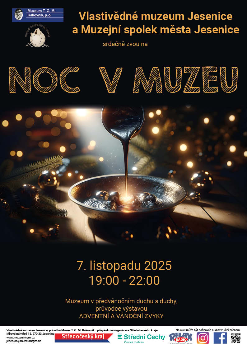 Vlastivědné muzeum Jesenice a Muzejní spolek města Jesenice srdečně zve na Noc v muzeu, na téma Adventní a vánoční zvyky. Rádi vás přivítáme 7. listopadu od 19 do 22 hodin. Seznámíte se s dávno zapomenutými tradicemi našich předků, zvyklostmi, které provází dlouhé období Adventu a Vánoc. Protože Vánoce patří mezi nejtajemnější období roku, potkáte se s postavami hodnými, ale i s těmi, které byste potkat raději nechtěli. Za svitu svíček a líbezných zvuků hudby si projdete muzeum v době večerní a noční. Přijďte s předstihem nasát trochu vánočního klidu.